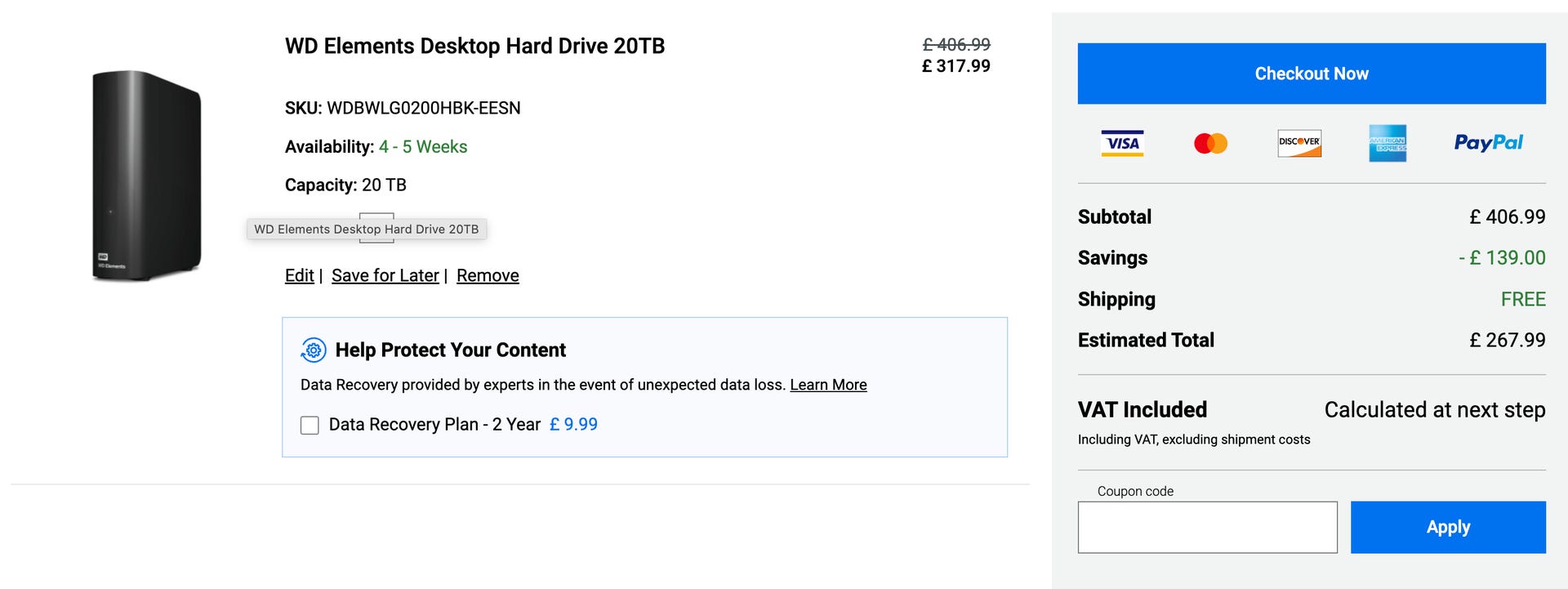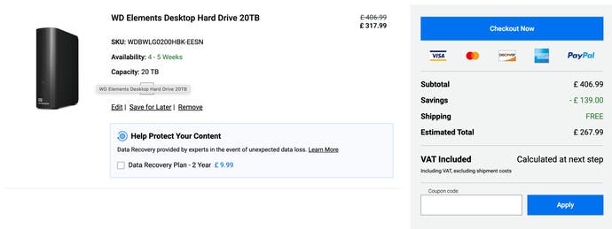 Western Digital has quietly added quite a hefty price cut on their own website at the moment, meaning it's possible to net this quite frankly huge 20TB Elements Desktop HDD for just £268. It's been marked down already to £318, but adding it to your basket gives you another £50 off with no need for a code. It works out to a price of just £13.40 per TB for a brand new drive - result.