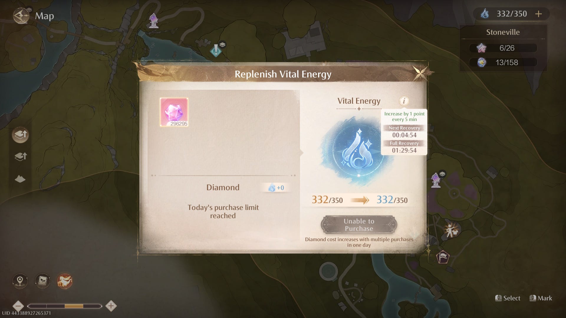 Vital Energy replenishes constantly at a rate of one every five minutes, capping out at 350. Once you reach this cap, Vital Energy stops accumulating, so make sure you spend as much as you can every day, or you're missing out on even more Realm rewards!